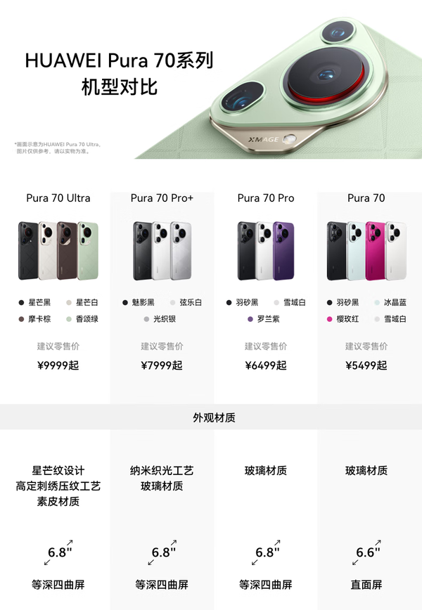 华为 Pura 70 Pro 采用全新的风向标模组系列,引领美学新风向。配色方面,提供罗兰紫、雪域白、羽砂黑三种配色可供选择。