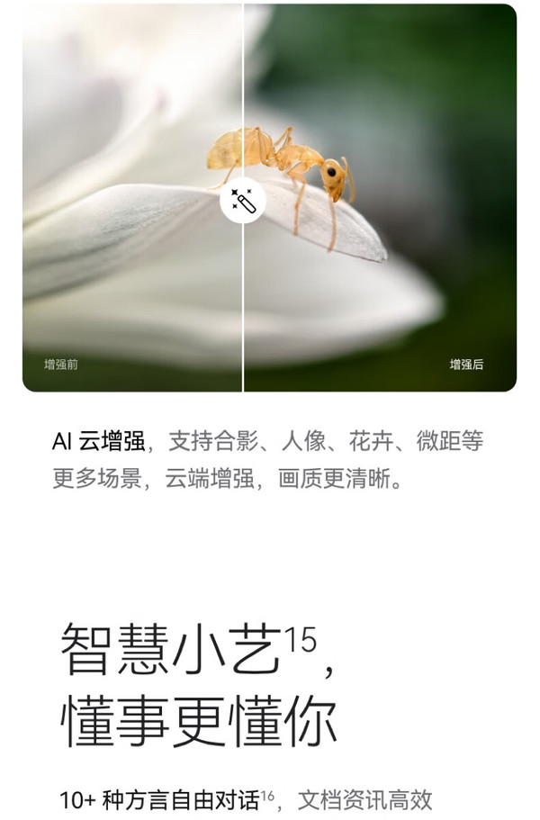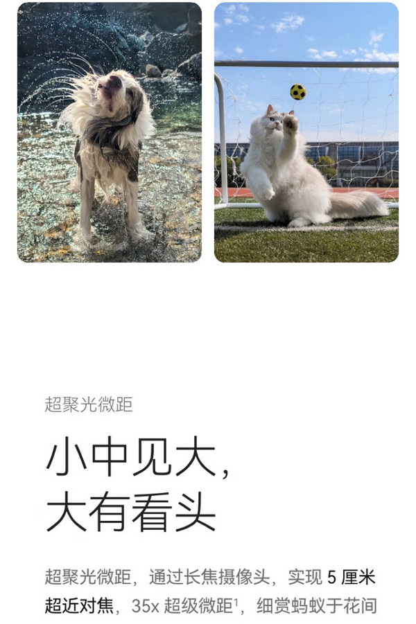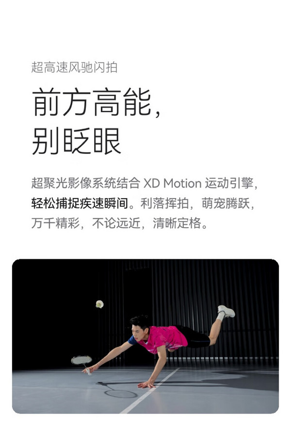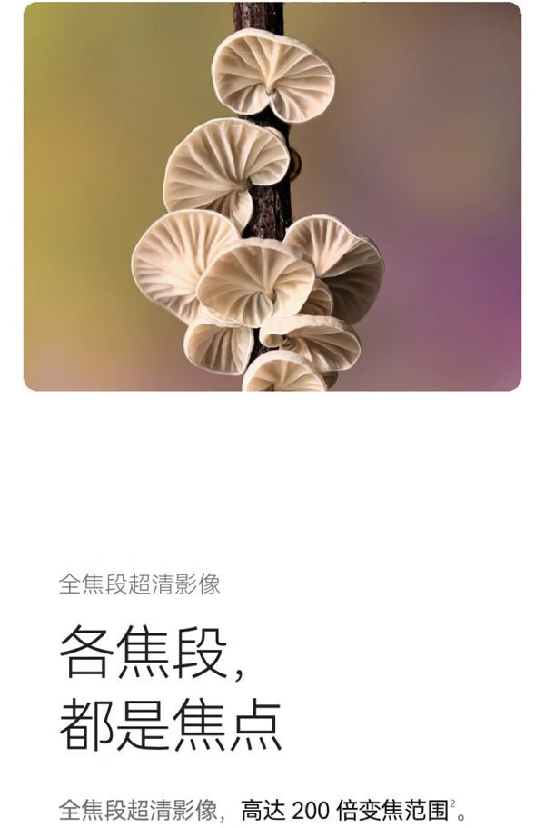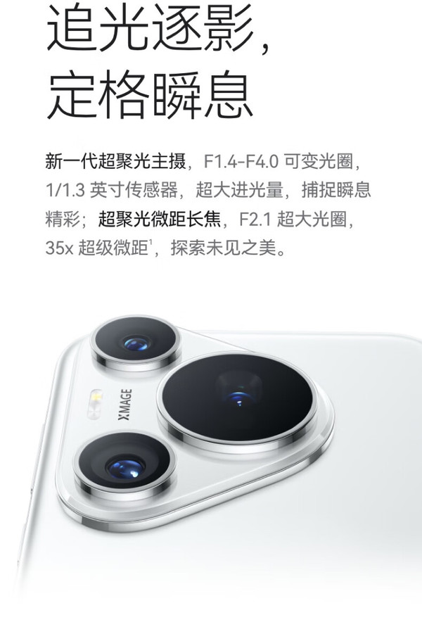影像方面,采用后置三摄(5000万像素超聚光主摄+1250万像素超广角镜头+4800万像素超聚光微距长焦镜头),主摄为1/1.3英寸传感器,支持F1.4-F4可变光圈。4800万像素超聚光微距长焦镜头,F2.1超大光圈,支持3.5倍光学变焦。同时支持35X微距拍摄,能够实现5厘米超近对焦,探索微观世界。XD Motion 运动引擎,能够轻松捕捉疾速瞬间。