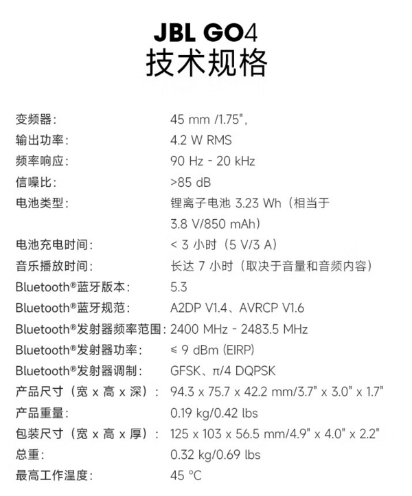 JBL GO4 蓝牙音箱同步潮流设计元素,时尚多色纯彩外观,提供烟影紫、爵士蓝、焦糖黑、月光白、活力红多种配色,打造个性专属音乐风格;出色材质工艺打造轻巧机身,质感与手感俱佳,一体式编织绳环设计,使用更随心、携带更方便。
