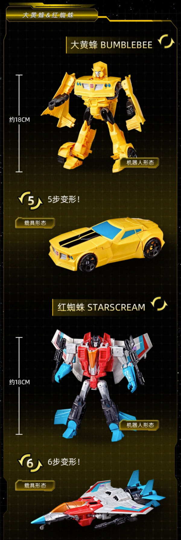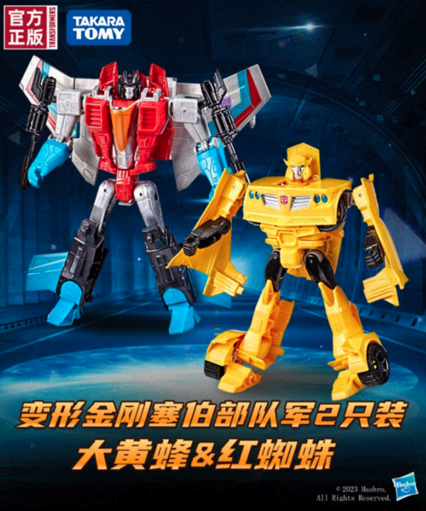 变形金刚塞伯部队军2只装,包含大黄蜂&红蜘蛛,每款高约18cm,大黄蜂款可由机器人形态5步变形成为载具形态,红蜘蛛则需要6步。