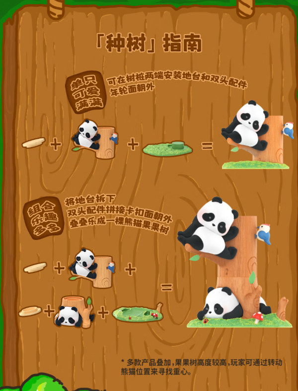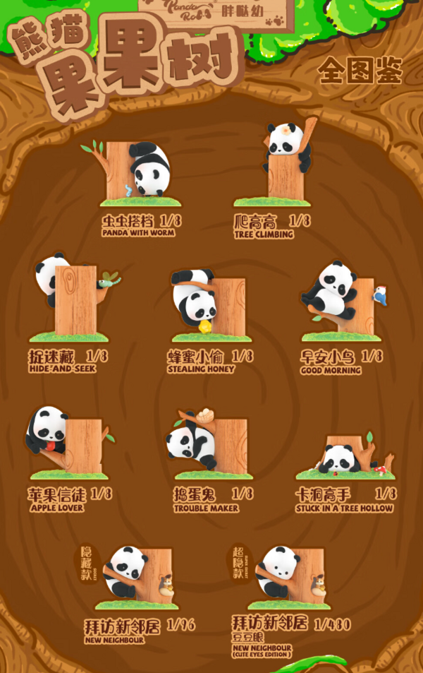 该款盲盒共有8个常规款,1个隐藏款以及1个超隐款。胖哒幼公仔均采用植绒工艺,附带树桩地台,每段树桩可相互叠加,组成一整棵熊猫果果树。
