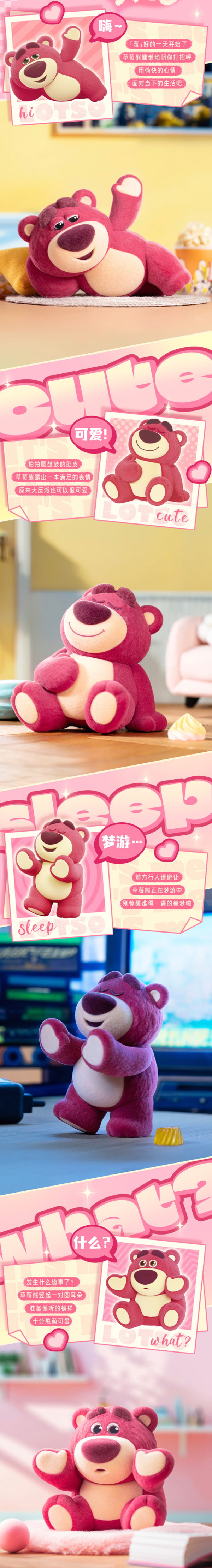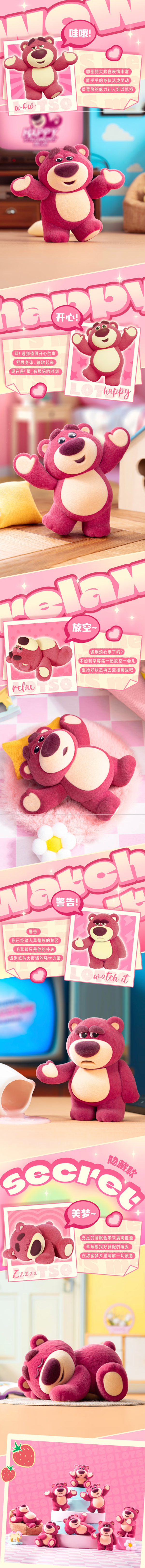 毛茸茸的外表下,藏着爱使坏的小心思,身上粉粉嫩嫩的,草莓色为反派身份增添一丝反差萌,它就是《玩具总动员》里的超人气角色——草莓熊。本次的盲盒尺寸为10cm,比一般的盲盒更有分量感~