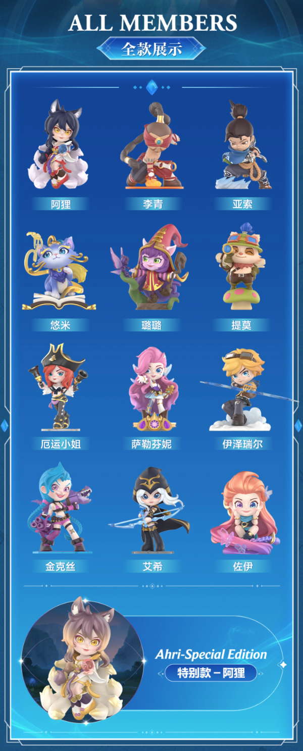 本系列盲盒以艾欧尼亚地区12位超高人气英雄为原型,进行原皮呈现,其中隐藏款为“阿狸异色版”。产品尺寸高约8.5cm,每款都Q版还原,服饰刻画细节清晰,快来pick你的本命英雄吧!