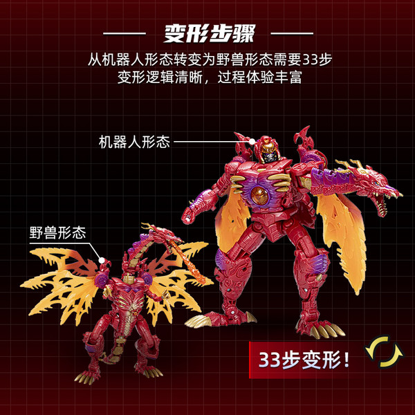 红龙的野兽形态完成度相当高,看起来也比较庞大,四肢灵活可动,翅膀可以展开折叠,还附带有喷火特效件,可单独对战或与同类型变形金刚组成互动。
