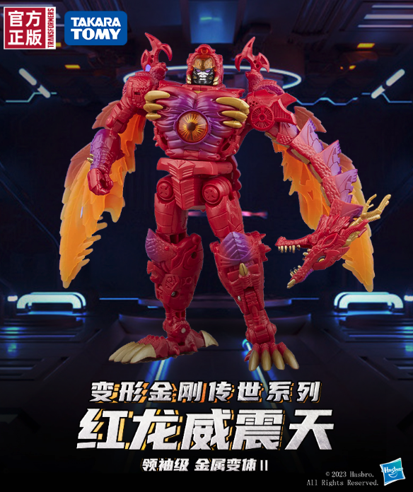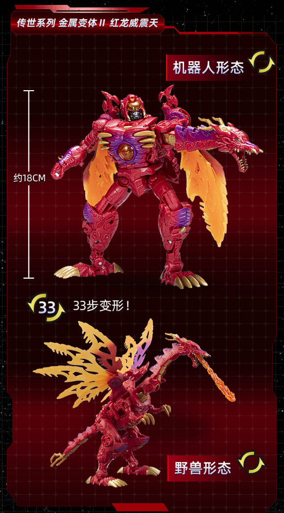 由Hasbro孩之宝推出的“变形金刚 传世系列 领袖级 金属变体II F3063 红龙威震天”高约18厘米,具有机器人形态和兽形形态。