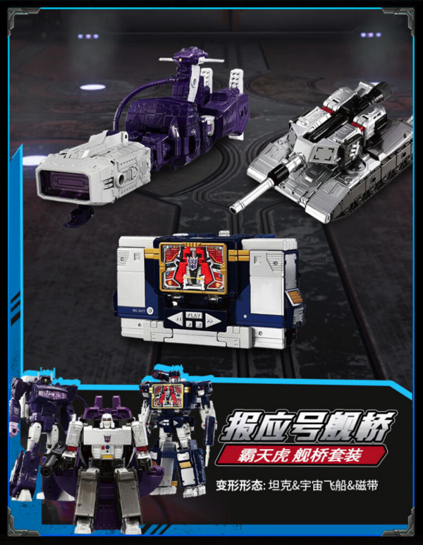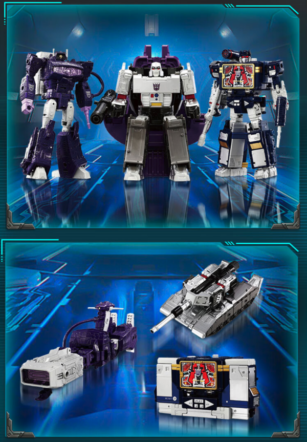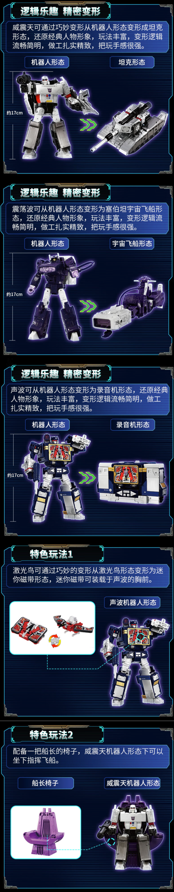 威震天、震荡波、声波机器人形态下高约11.5CM,经过简单变形可形成坦克、飞船、录音机形态。此外,包含两种特色玩法:1、激光鸟可通过巧妙的变形从激光鸟形态变形为迷你磁带形态,迷你磁带可装载于声波的胸前。2、配备一把船长的椅子,威震天机器人形态下可以坐下指挥飞船。
