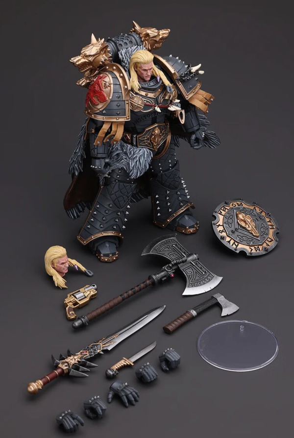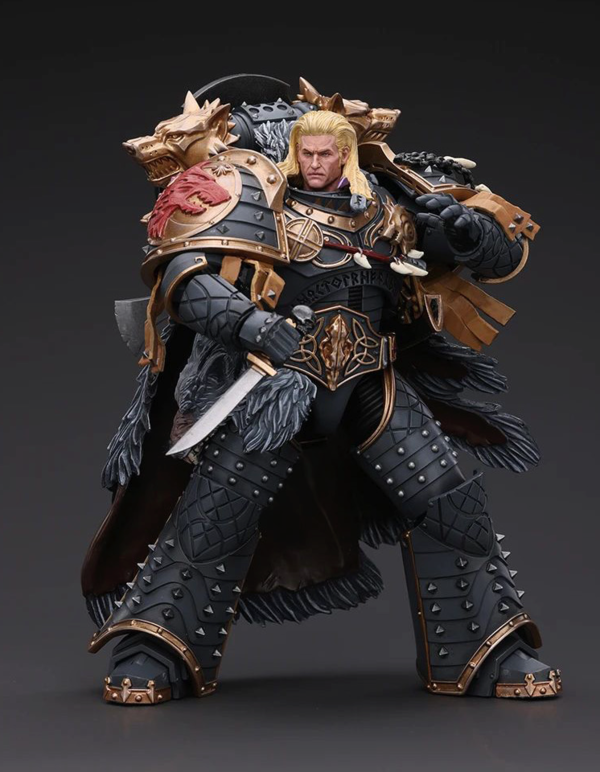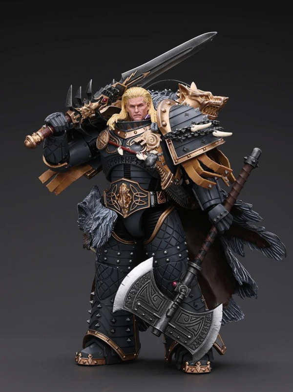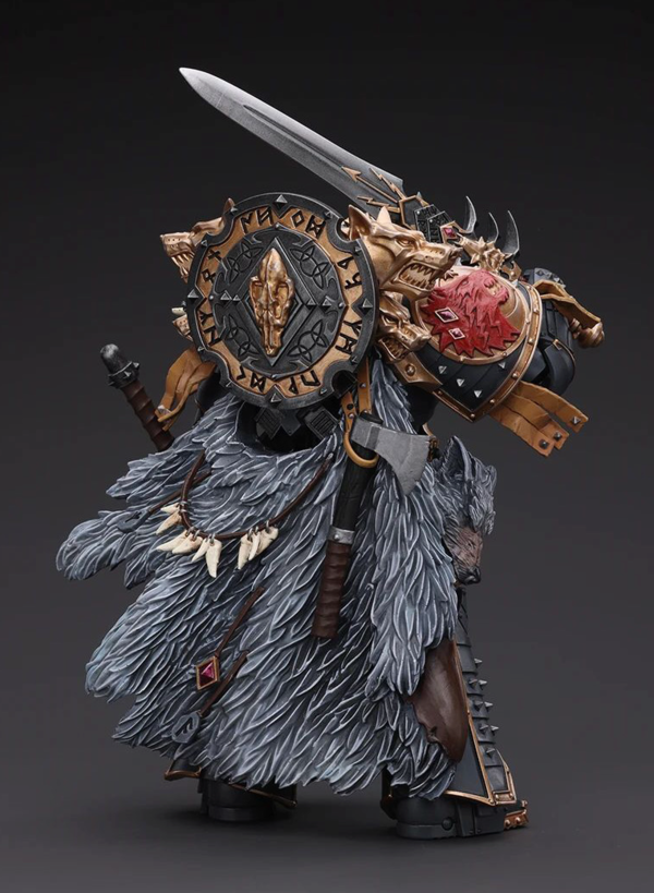 黎曼·鲁斯手持战斧加巨剑,背着一块盾牌,一身黑色的动力装甲,双肩配有金色狼头装饰,狼毛披风,上面挂着一圈狼牙装饰,彰显着他无与伦比的武力。