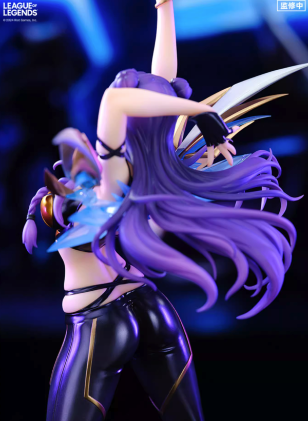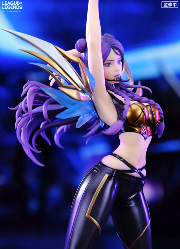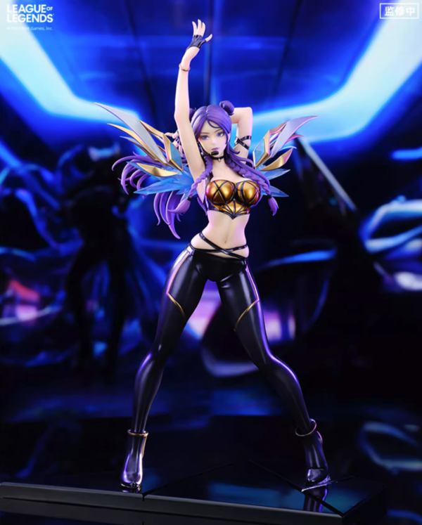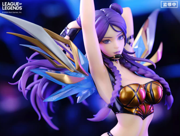 手办整体高约30.9cm(含地台),舞台上的「卡莎」动感十足,身后闪耀的荚囊采用透明材质打造,珠光材质上色工艺辅以多层光油还原衣裤短靴漆皮质感,光线照射下呈现出丰富色彩。手环的金属质感、嘴边的麦克风再到服装的细微褶皱均得到了细致还原。