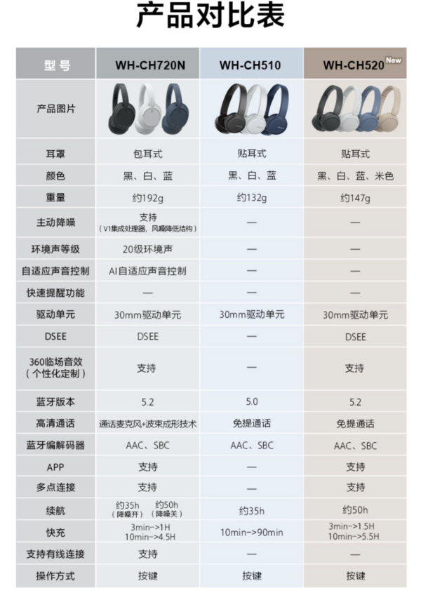 这款耳机拥有黑色、白色、蓝色、米色多种颜色可选。索尼经典调音,使用数字声音增强引擎,悦耳动听。预设8种音效,支持自定义均衡器。支持360音效。约50小时长效续航,支持快充。