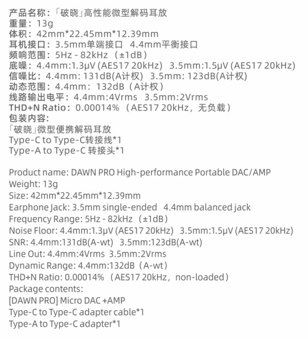 破晓可兼容当前市面上大部分电脑、手机和平板电脑,并且可硬解播放16bit/44.1kHz到32bit/384kHz的PCM音源以及高达DSD 256的1bit音源。131dB动态范围,失真低至0.0001%,信纳比超过116dB,4Vrms/160mW输出功率。带有3.5mm+4.4mm耳机接口。