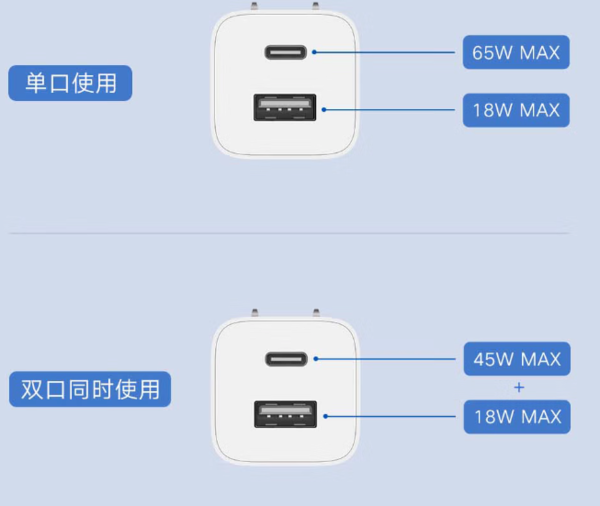 GaN是一种新型半导体材料。具有超强的导热效率、耐高温和耐酸碱等特性,最终令充电器不仅可以做到小体积和轻重量,在充电功率转換上相比同功率充电器 (非GaN)更具优势。仅69cm大小,掌心可握,轻轻松松放入 口袋。Type-C接口单独输出功率达65W,可为新款 小米笔记本、Macbook Pro等大功率设备充电。USB-A接口单独输出时功率可达18W,两个接口可同时为电子设备提供快充。可为小米11提供适配原装充电器的充电功率,45分钟即可充100%。 小米GaN充电器65W(1A1C)可为iPhone12提供快速充电,30分钟即可充电至60%,充分发挥设备的快充性能。内置E- Marker芯片,支持最大5A电流,充电更快。1.5m线长,满足不同场景下充电需求。产品尺寸为31*31*71.8mm。