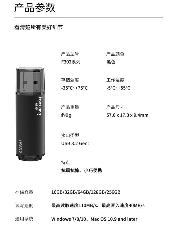 采用稳定存储新品,USB3.2高速接口,读取速度高达110MB/S,省事省心,金属外壳,结实耐用,防震抗摔,防尘抗震、稳定耐用、小巧便携。支持手机、PC、智能电视、车载音响以及数码播放器等设备,即插即用,简单便捷,满足不同需求。