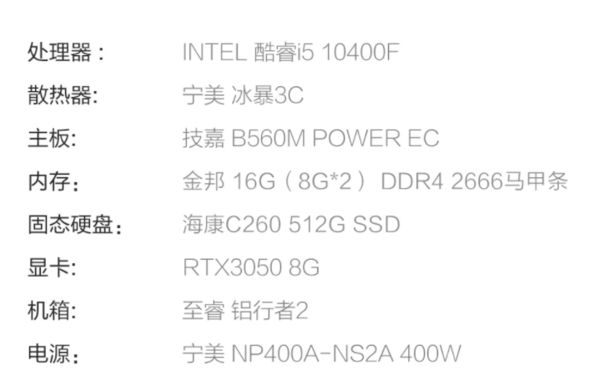 宁美 魂-GI81 分享版 采用10代酷睿i5-10400F处理器,搭配GeForce RTX3050 8GB光追独显,B560M主板,16GB D4内存 + 512GB NVMe 固态硬盘,400W电源提供动力。