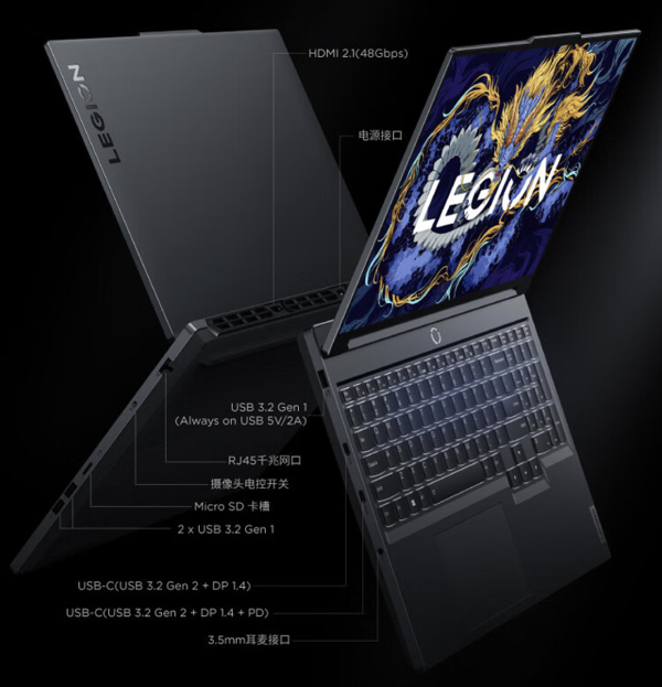 配备LEGION TrueStrike原感键盘,可更换键帽设计,下沉式大尺寸方向键,标准尺寸小键盘区,全键无冲,微弧键帽贴合指腹,1.5mm属实键程,两段回弹结构;配备120mm*75mm大尺寸一体式精准触摸板。