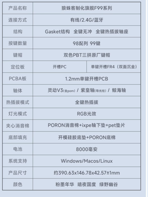 狼蛛F99机械键盘,共有暗夜国度、星落凝云、粉墨年华、绿野幽谷三种配色,轴体有灵动轴V3、紫皇轴、鲸海轴、灰木轴V3可选,定位板可选PC定位板和FR4双面沉金定位板。键帽采用PBT材质纹理细腻、长久耐磨。
