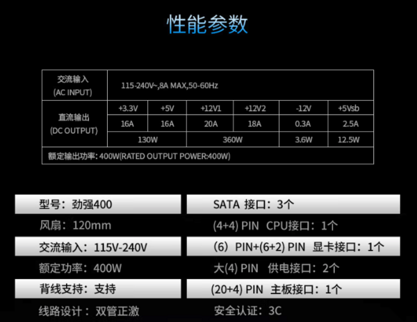 电源外壳黑化处理,防腐蚀、抗氧化、防汗渍、保护内部元件,120mm风扇、高密度散热孔,液压轴承低噪运转配合大面积蜂窝散热孔快速降温,为应对部分地区电压不足、电压不稳定、电压过高等使用环境,电源采用宽幅电压设计:115V-240V,满足不同环境应用需求。
