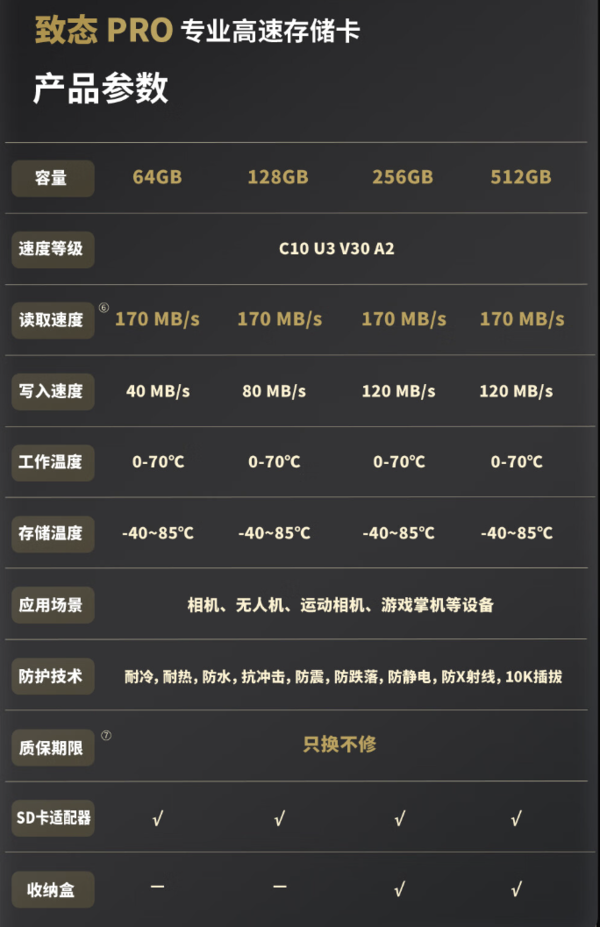 这款产品通过兼容性测试,适用于相机、无人机、运动相机、游戏掌机等设备,即插即用。全容量标配原厂SD卡适配器,256GB、512GB额外附赠收纳盒。提供多种容量选择。具备耐冷、耐热、防水、抗冲击、防震、防跌落、防静电、防X射线、10K插拔等多重防护设计。内置创新断电保护机制,可避免突然断电导致数据丢失或文件损坏的风险。采用基于长江存储晶栈Xtacking架构的闪存颗粒,提供只换不修服务,安心使用售后无忧。