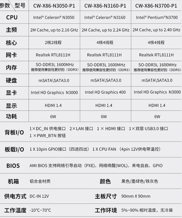 软路由迷你主机采用X86架构,拥有4核心4线程,仅6W低功耗。拥有双网口设计,Realtek板载RTL8111H全千兆网卡芯片。支持单条SO-DDR3 8GB内存,支持1个mSATA+(SATA3.0需额外给硬盘供电),支持双USB3.0接口,支持HDM11.4(带音频输出)高清显示,支持英特尔虚拟化技术(VT-x),支持可编程的四进四出GPIO接口,板载1个4Pin12V带温控CPUFAN风扇供电接口,整机全铝机箱无风扇被动散热、防尘、零噪音。