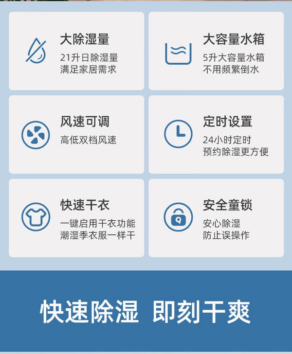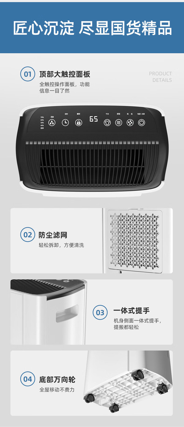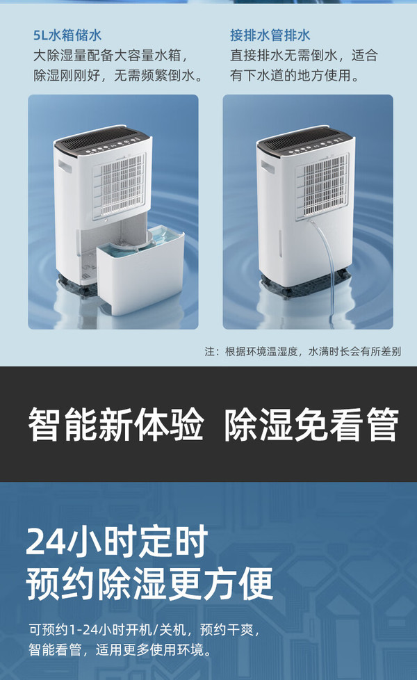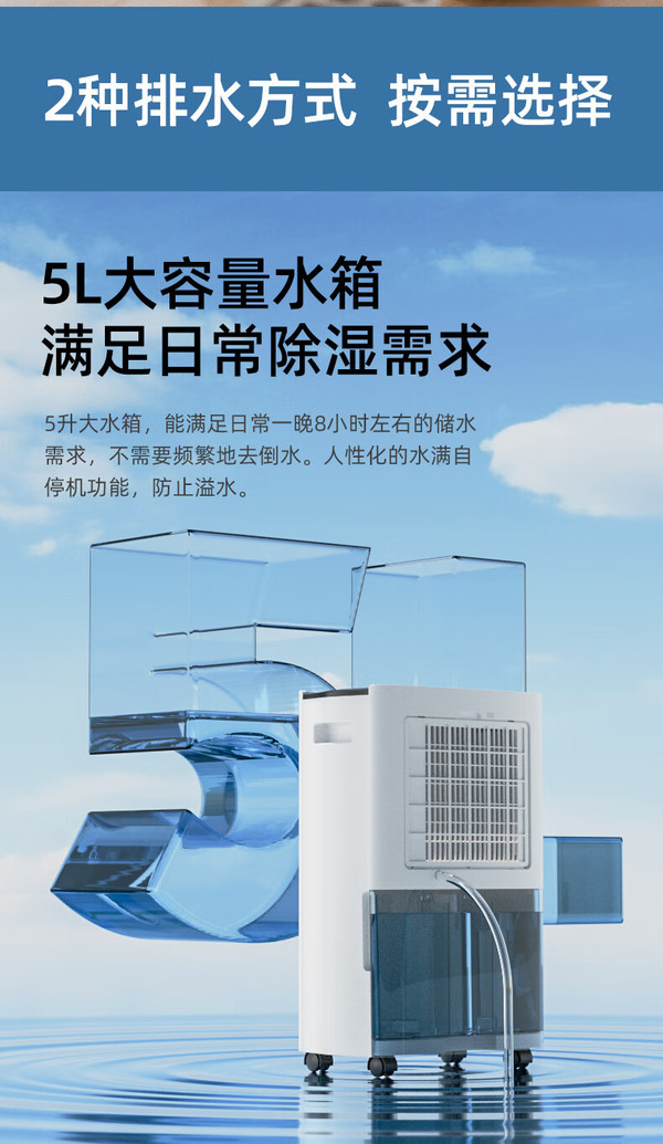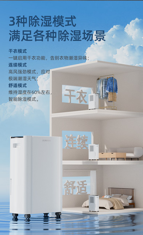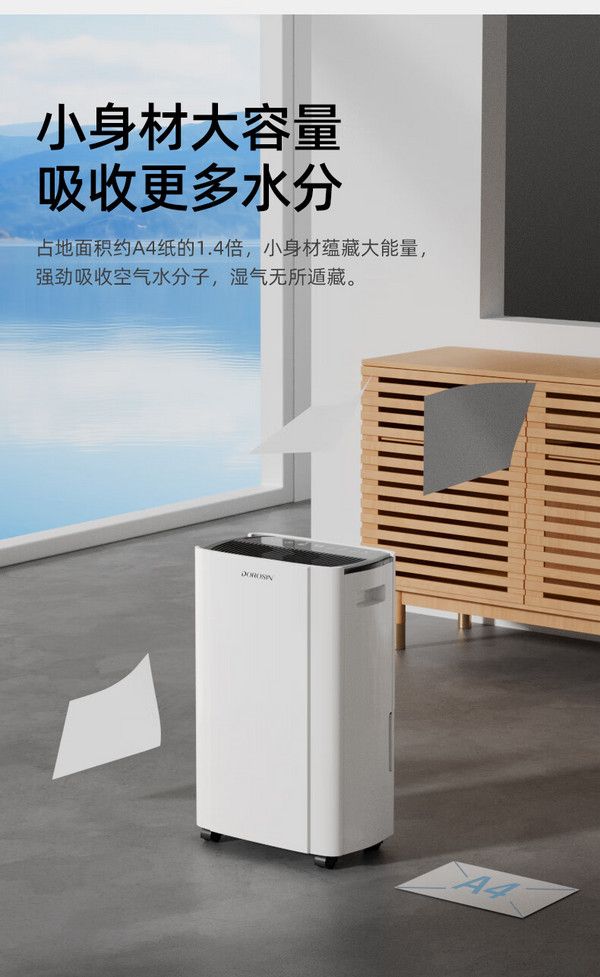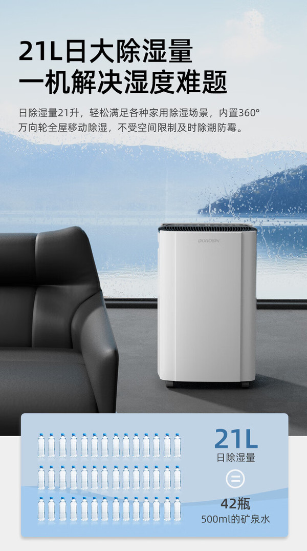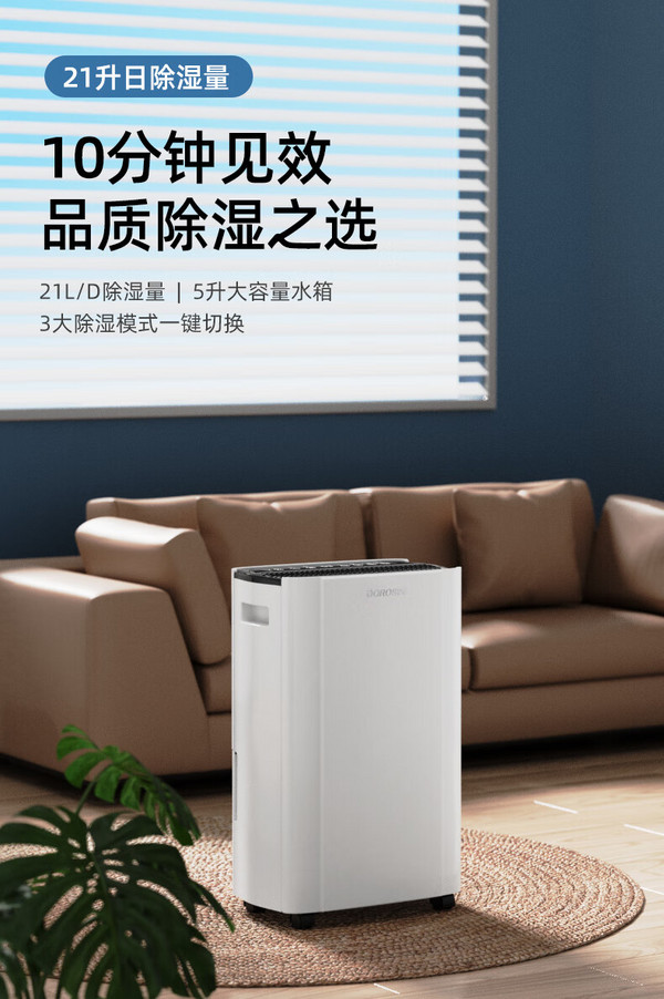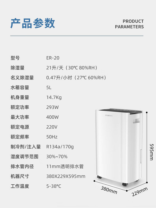 多乐信(DOROSIN)这款型号为ER-620E的除湿机,搭载有松下双转子压缩机,配合双直排蒸发器,可实现高达20升的日除湿量,适合在40-120平米大小的居室内使用,产品水箱容量5升,支持水箱/外接排水管双排水。带有水箱水满提示,支持水满自动停机以及自动除霜功能,有效提升了日常使用的便利性。带负离子净化,支持自动检测温度,定制合适除湿方案,支持最长24小时预约开机,定时关机,最大运行声噪小于41(db);产品尺寸380X230X600mm。