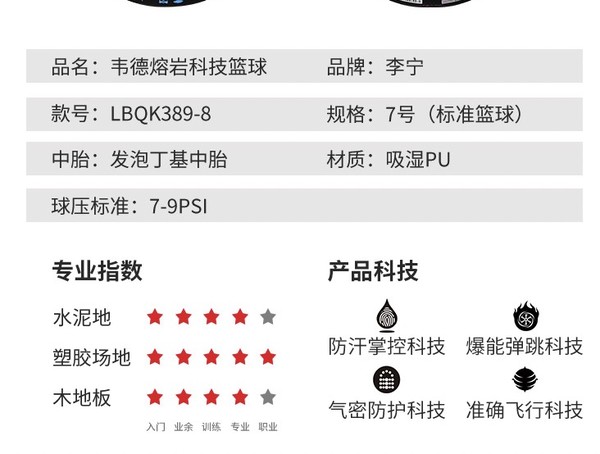 韦德熔岩科技篮球,特殊的砂感,防尘防汗,软弹科技,李宁吸湿PU表皮皮颗粒清晰,防尘耐打,防滑,更易掌控,多场地适用的比赛用球。