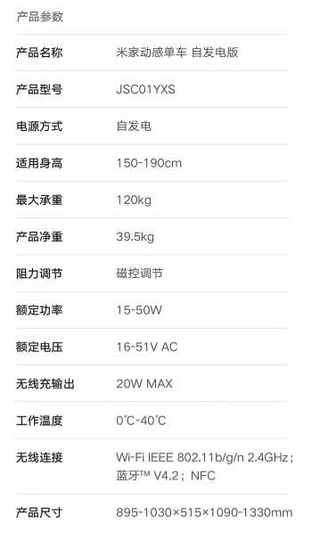 米家首款自发电动感单车,大功率自发电,不插电随处开练,20W无线快充,骑行中还可为手机充电,骑行零耗能,开启绿色健康生活。50W大功率自发电技术,骑行即为单车供电。不插电、无线缆,阳台客厅卧室,随时随地开启训练。20W双线圈无线快充技术,可将骑行能量转化为电能,为手机充电,燃脂又环保。另配置Type-C快充接口,有线也可充。占地约0.45m,沙发旁、阳台、卧室里,都能摆得下;机身净重约39.5kg,搭配前置滚轮设计,女生一个人也可轻松移动。采用流畅弧形磁片设计,有效降低自发电的噪声,不扰家人不扰邻,不论清晨或夜间,只管肆意开练。一键启停,左右旋转即可调阻,一体式中控屏,可显示踏频、卡路里等数据;1-32挡阻力,轻松切换运动强度。飞轮全包设计,骑行时飞轮隐藏不外露,无需担心磕碰,避免意外卷入,给家人和宠物贴心保护。车身搭载多彩然脂环,骑行过程中能够清晰看到当下的卡路里消耗状态,享受暴汗快感。空调、热水器等智能产品可联动单车,按需定义更舒适便捷的运动场景,尽情享受运动的乐趣。