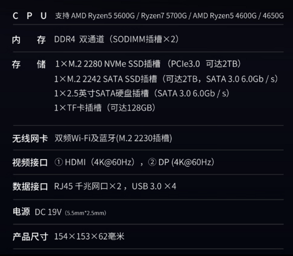 这款准系统主机支持AM4 APU(4000和5000系APU),拥有2个RJ45网口,支持双通道内存,支持M.2 2280 NVMe固态硬盘,内置蓝牙、WiFi。