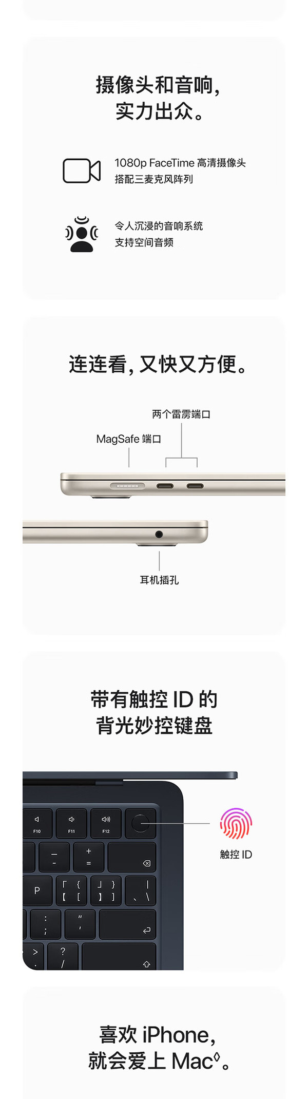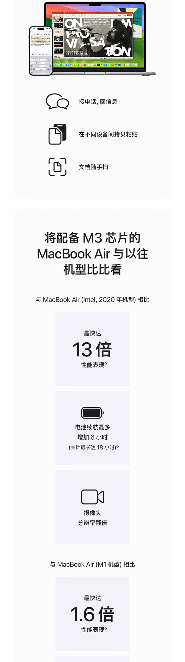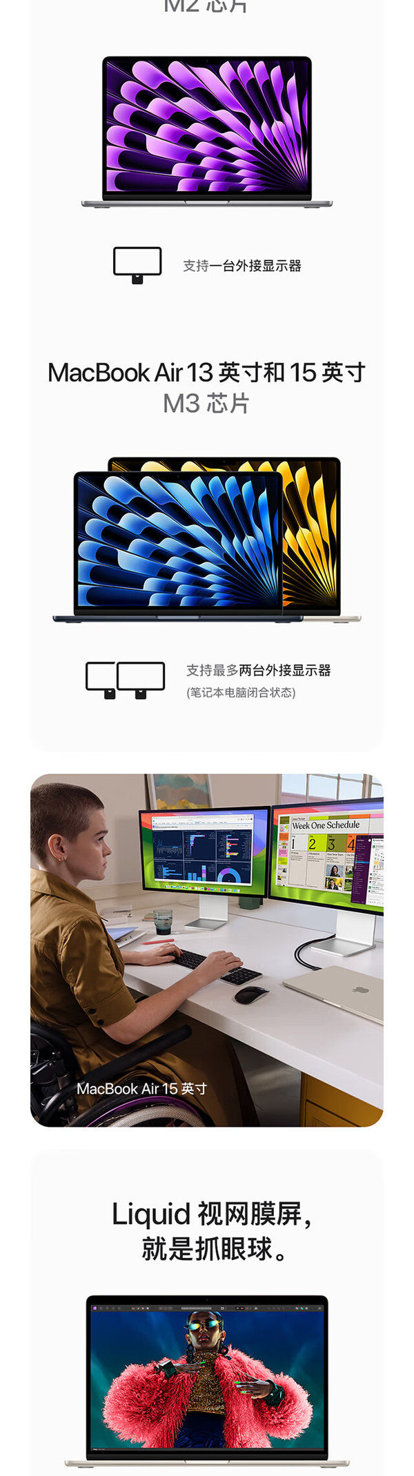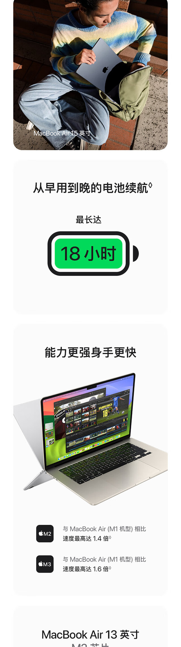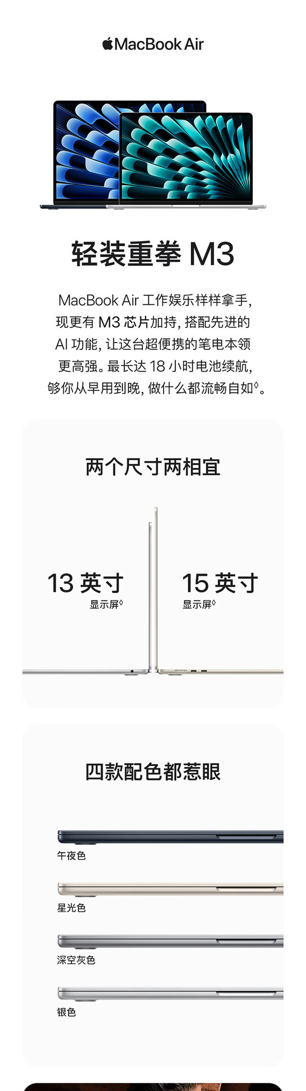 新款MacBook Air依旧采用轻薄的无风扇设计,机身厚度不到1.2厘米,同时带来强大功能和便携性,颜色方面提供午夜色、星光色、深空灰色和银色四款,其中午夜色外特别运用了突破性的阳极氧化密封工艺来减少指纹。同时此次的新款MacBook Air是 Apple 首款再生材料占比达 50% 的产品,其中机身采用 100% 再生铝金属,所有磁体均采用 100% 再生稀土元素,另外在主板中 Apple 还首次采用了 100% 再生铜。屏幕方面配备13.6 英寸Liquid 视网膜显示屏 ,亮度最高达 500 尼特,支持 10 亿色彩,并拥有同尺寸笔记本电脑中最高达两倍的分辨率,支持原彩显示。使得画面内容看起来生动鲜明,细节更加锐利。此次新款 MacBook Air 的核心亮点在于其 M3 芯片,采用8核中央处理器,具有4个性能核心和4个能效核心,支持8核图形处理器,硬件加速光线追踪,支持16 核神经网络引擎,内存带宽支持100GB/s。 同时这款芯片在CPU和GPU性能上都有所提升,官方宣称相比搭载 M1 芯片的 MacBook Air 机型,速度提升最高达 60%,相比搭载最快 Intel 芯片的 MacBook Air 机型,速度最快达 13 倍。并且加入了AV1解码引擎。更值得一提的是,M3芯片集成的16核神经网络引擎为AI应用提供了强大的支持,使得macOS能够提供诸多智能功能,如实时语音转文本、翻译、文本预测等,极大地提高了用户的生产力和创造力。此次除了新的 M3 芯片之外,新款 MacBook Air 还支持 Wi-Fi 6E、“语音隔离”和“宽广频谱”麦克风模式,并提升了音视频通话中的语音清晰度。更重要的是,新款 MacBook Air 在合盖状态下最多可连接两台外接显示器,相比过去仅支持一块外接显示器的苹果自研芯片机型带来了显著提升。拓展方面,MacBook Air 还具有 MagSafe 充电功能、两个用于连接配件的雷雳端口和高达 6K 的外置显示器,以及一个用于多功能连接的 3.5 毫米耳机插孔。续航方面,官方宣称长达18小时的电池续航。MacBook Air 上的 1080p 高清摄像头非常适合 FaceTime 通话和视频会议,三麦克风阵列使用先进的波束成形算法捕获干净的音频,结合M3上高级图像信号处理器的处理能力,用户在视频通话中看起来会更清晰,声音听起来更准确。还配备非凡的六扬声器音响系统,带有两个高音扬声器和两组谐振抵消扬声器,提供两倍的低音深度,以获得更饱满的声音,支持杜比全景声的空间音频提供身临其境的体验,无论是听音乐还是看电影。macOS Ventura将Mac体验提升到一个全新的水平,助力用户生产力实现。