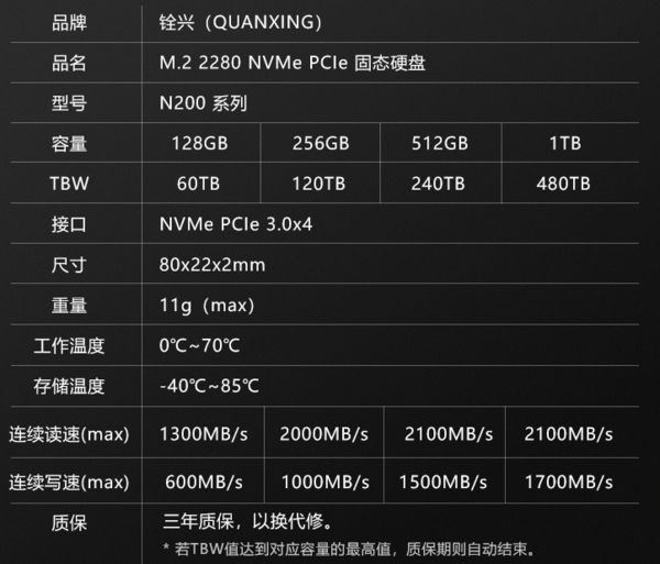 铨兴 N200 固态硬盘有128GB、256GB、512GB、1TB四种内存规格,采用TLC颗粒,256GB读取速度2100MB/s,写入速度1000MB/s。兼容主流操作系统,支持三年质保。