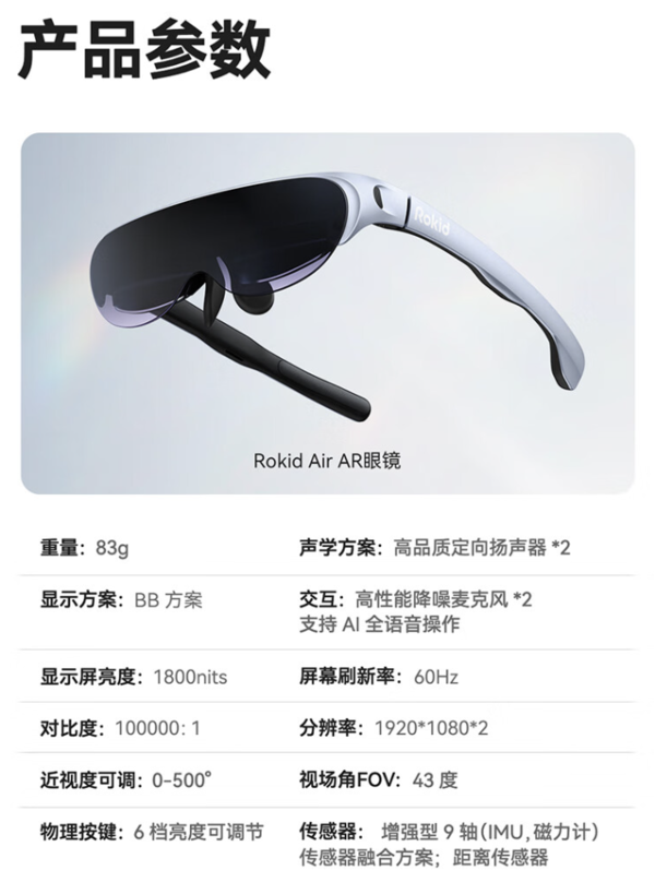 这款AR眼镜可以带来灯效3-4米距离120寸大屏幕,拥有1080p分辨率,55PPD角分辨率,支持60Hz刷新率,1800NITS亮度,43FOV可视角,通过德国莱茵护眼认证。500°内近视可调,双眼可单独调节。镜腿带有音响,定向立体声场,向耳内传声。