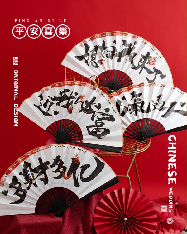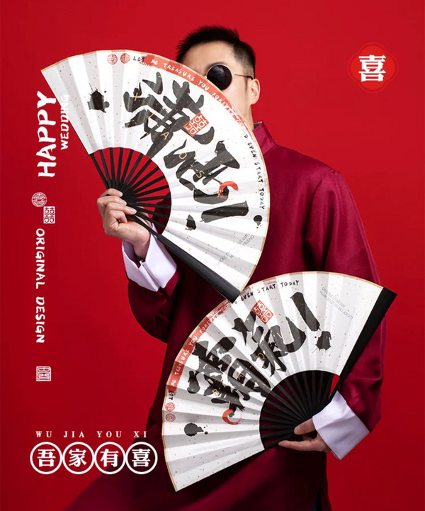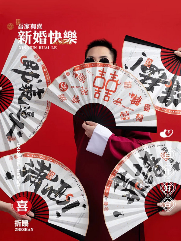 迎亲拍摄道具,多款样式可选,文字多样、态度鲜明、趣味满满。宣纸竹木,扇面洒金,质感在线。